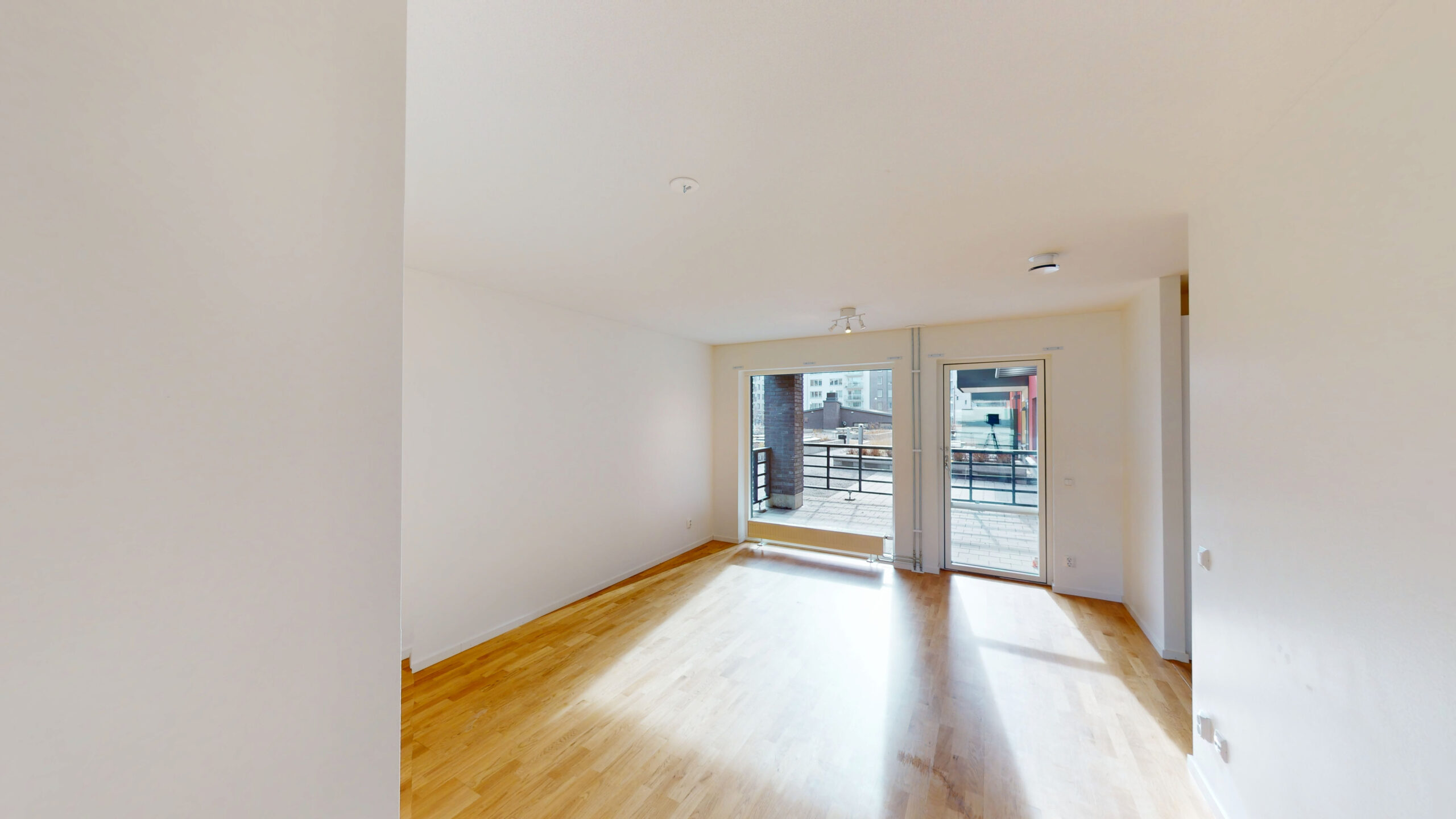 Lägenheten ligger en halv trappa upp med fönster i två väderstreck. Öppen planlösning med både en uteplats i sydvästligt läge och en balkong åt nordost.